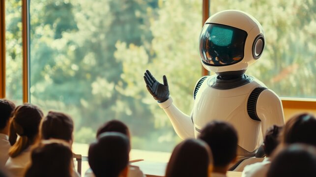 A humanoid robot is teaching a group of people in a bright, natural setting, emphasizing the integration of technology in education.
