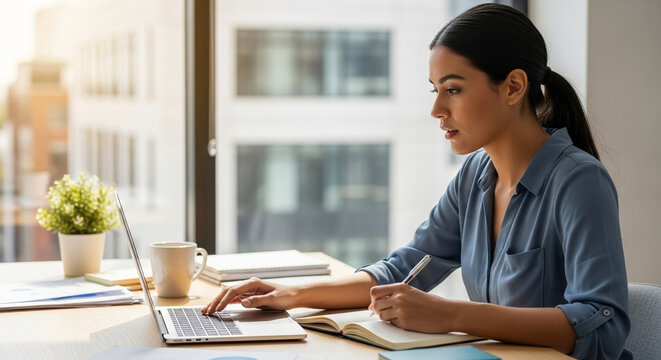 Portrait young latina or indian business woman using laptop pc working at desk writing notes, watching educational online webinar. Female student looking at computer screen device, studying in office