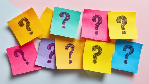Vibrant Sticky Notes with Question Marks Symbolizing Inquiry, Ideas, and Problem Solving.