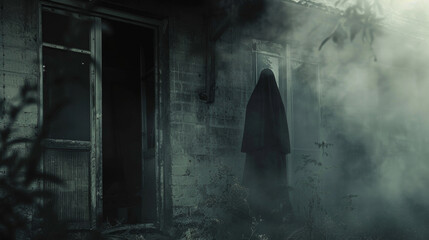 A ghostly figure shrouded in mist standing in the shadows of a dilapidated storefront. . .