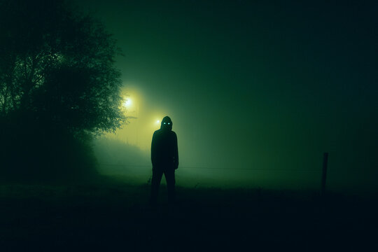 A threatening supernatural figure with glowing eyes, Silhouetted on a spooky foggy night in the countryside