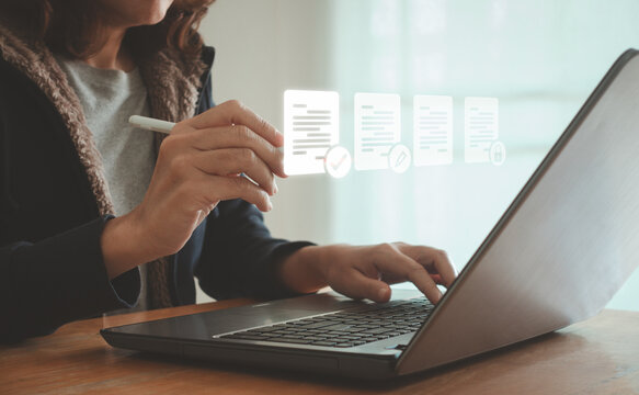 Business Document Review Quality Control Process Management System Technology. Woman use laptop with digital icon for checklist, assurance approval, performance tracking, QC, ISO standard certificate.