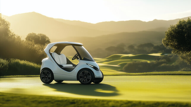 Golf cart isolated on white background. Modern electric microcar in white and black is shown in a 3D rendering.