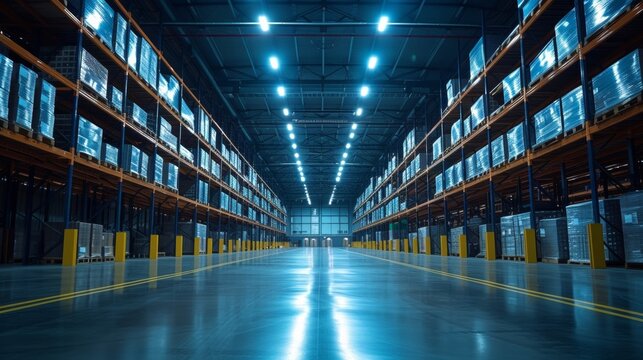 This futuristic warehouse leverages robotics and automation to streamline inventory control and distribution, ensuring a systematic and efficient industrial process.