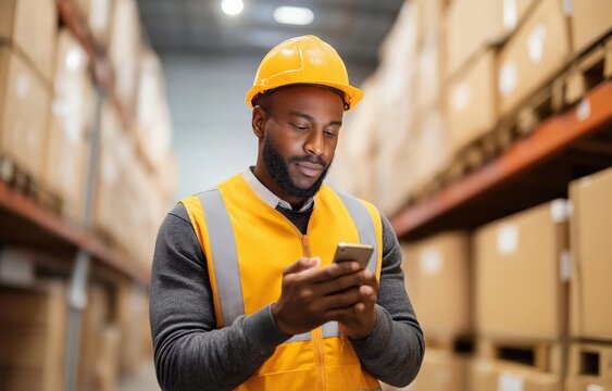 Warehouse Worker's Tasks: A focused warehouse worker meticulously reviews logistics information amidst rows of inventory in a large distribution center, dressed in the essential gear.