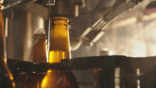 Beer bottles travel along a modern automated bottling line, being filled with golden beer in a clean industrial brewery plant, showcasing fast, efficient production and machinery detail