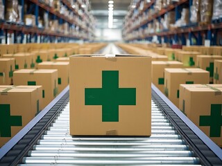 Efficient Medical Supply Chain: Cardboard Boxes with Green Crosses Move Along Conveyor Belt in Modern Warehouse