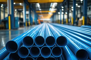 Industrial hall with symmetrical tracks, bright overhead lighting, blue tint