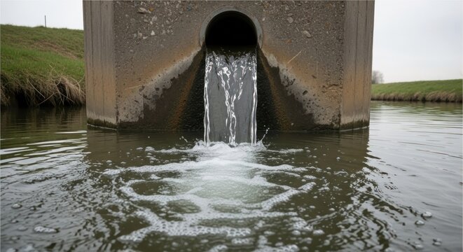 Murky water gushes from a concrete drainage pipe into a cloudy river