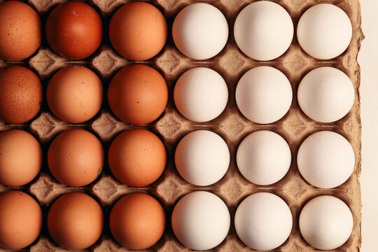 Photograph of egg carton with white eggs and brown eggs. Food concept.