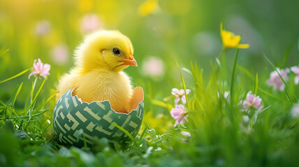 A small yellow chick in the half of an Easter egg on the green grass with spring flowers