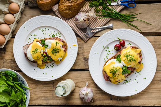 Classic eggs benedict dish, home cooked or restaurant menu dish.