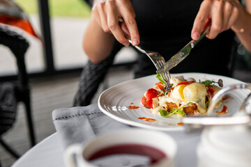 Hands cutting eggs benedict on a plate with hollandaise sauce, garnished with greens, served with tea on a casual dining table—fresh and appetizing breakfast scene.