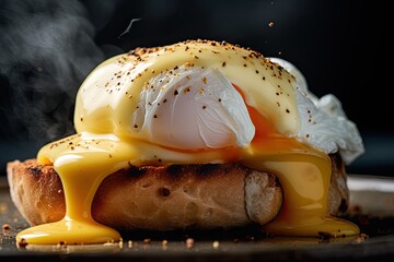 Close-up shot of a plate of perfectly crafted Eggs Benedict, each element harmonizing to create a mouthwatering masterpiece