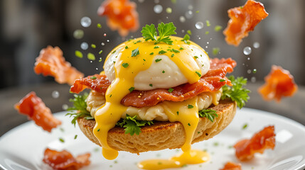 A delightful plate of eggs Benedict with poached eggs, Canadian bacon, and hollandaise sauce