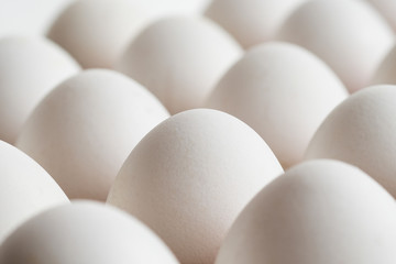 Tray of white fresh eggs close-up on a cardboard form. Agricultural industry