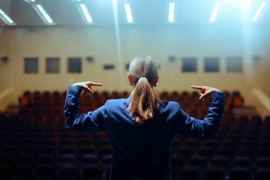 Arrogant Leader Rehearsing a Public Speech Pointing to Herself. Narcissistic politician getting ready to deliver her message on stage