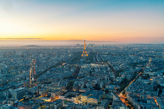 Skyline of Paris with Eiffel Tower in Paris, France. Panoramic sunset view of Paris