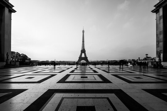 Eiffel Tower, French: Tour Eiffel, silhouette at dawn. View from Trocadero Square with geometrical marble pavement. Paris, France. Black and white photography.
