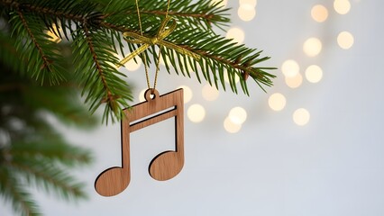 Wooden musical note ornament hanging on a green christmas tree branch with soft, blurred bokeh lights in the background, symbolizing holiday music and celebration