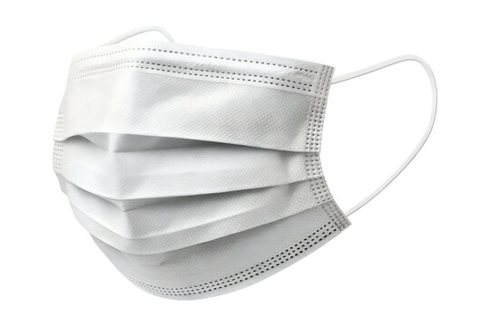 A white disposable medical face mask with pleated layers and elastic ear loops, isolated on a clean transparent background, available as a png.
