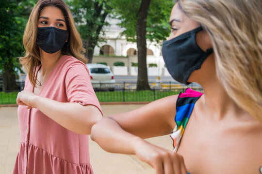 Couple of friends greets with elbow bumping in the coronavirus pandemic new normal. Handshake in quarantine new normal time. Elbows bump. Two people bump elbows. Friends in safety mask