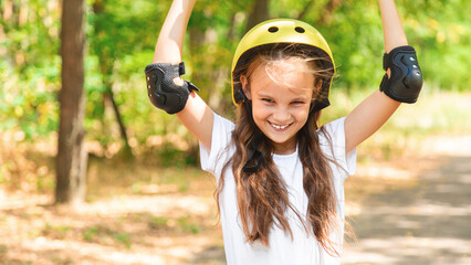 Girl skateboard with safety equipment - helmet, knee and elbow pads. Safe summer activity. Kids activity.