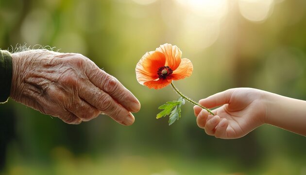 An elderly hand offers an orange flower to a child's hand in a serene, natural setting, symbolizing connection and the beauty of giving.