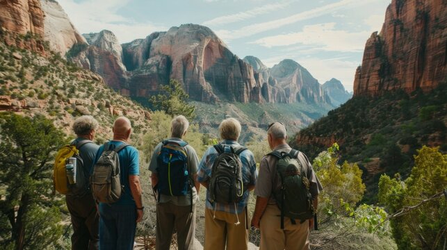 An elderly adventurer in an orange backpack gazes at the magnificent mountain panorama, appreciating nature’s beauty during a tranquil hike in the afternoon