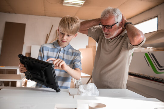 Grandson teaching his grandfather carpenter how to use a tablet to improve their work. The grandson shares his tech knowledge, helping the grandfather integrate modern tools into their craft.