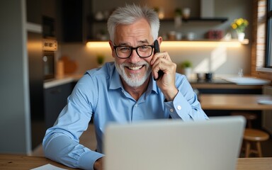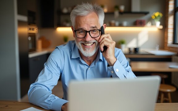 Happy busy middle aged mature man senior entrepreneur talking on mobile phone looking at laptop using computer calling on cellphone working at home sitting at kitchen table.