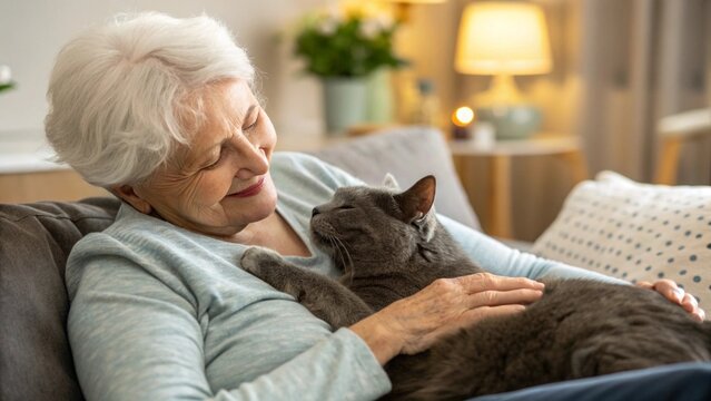 Senior happiness with cat care at home, caring moment between elderly woman and her cat. Elderly woman smiles warmly while touching her cat in a cozy setting.