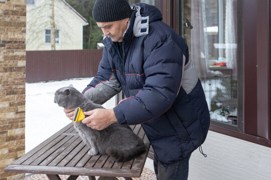 Senior male brushing pet outdoors near house highlighting daily routine compassion and calm interaction with animal.