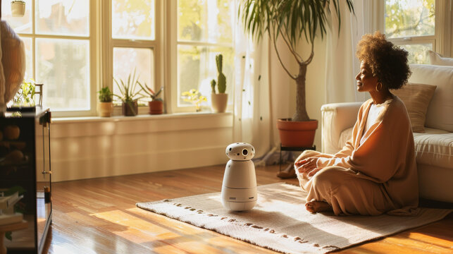 Woman enjoying peaceful time with a friendly robot at home