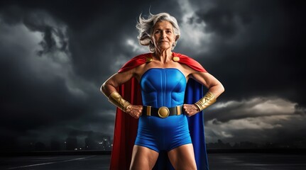 An elderly woman embraces her superhero persona with confidence against a dramatic stormy backdrop in a powerful display of strength