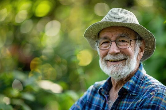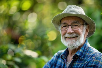 portrait a father day concept old man, wear glasses and hat, blurred background with white beard