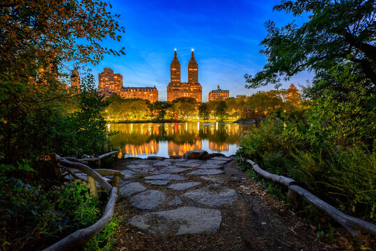 Skyline with apartment skyscrapers over lake in Central Park in midtown Manhattan in New York City