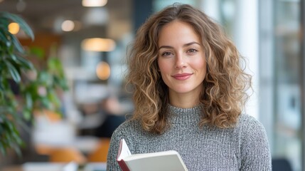 A woman with curly hair gives a serene smile while holding a book indoors, portraying contentment, knowledge, and the joy of learning in a brightly lit, inviting space.