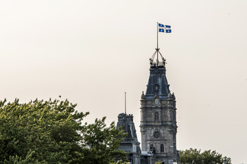 QUEBEC CITY CANADA blue white flag proudly on top of clock tower of parliament building of national assembly of Quebec
