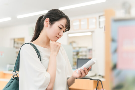 薬局・ドラッグストア・コンビニエンスストアで化粧品・コスメの買い物をする女性