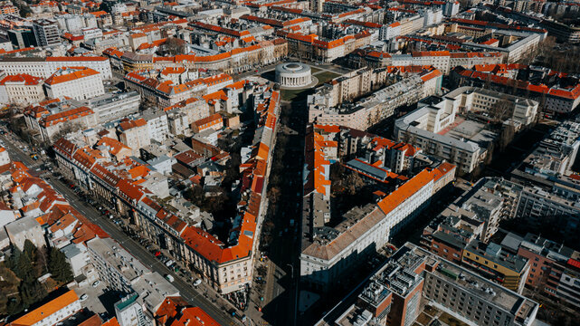 Historic main street in mountain town with colorful metal roofs and period buildings