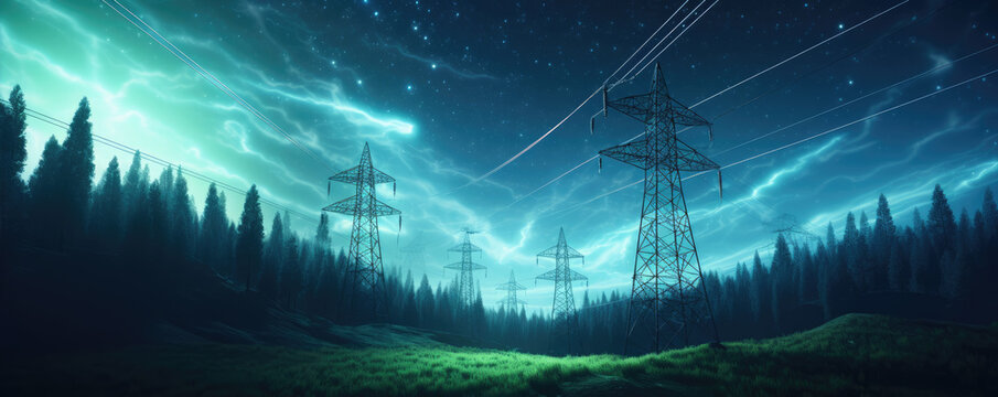 High voltage electric transmission tower with glowing current lines at night, representing renewable energy