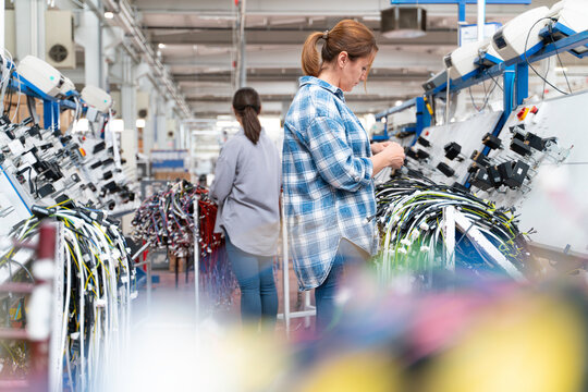 Women in a production line is working on a machine in a auto cable factory. There are many colorful wires in the foreground and background.