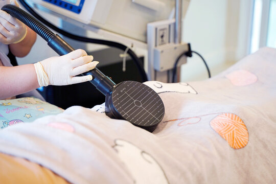 Closeup hands of physical therapist using electrical muscle stimulation (EMS) at elderly patient's legs in blankets  in nursing homes