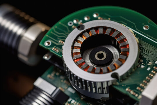 extreme close-up of an industrial encoder with highly detailed circuitry and precision-engineered components