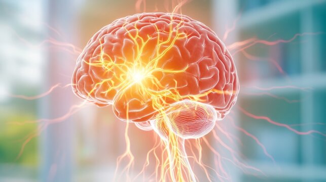 Glowing human brain experiences electrical impulses and neural activity.
