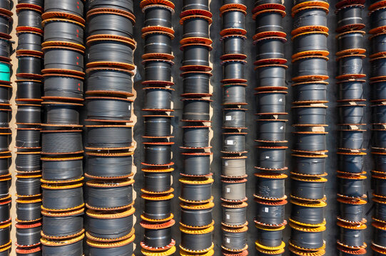 A collection of neatly arranged yellow cables on a vibrant yellow background, symbolizing order, technology, and the potential for connection and communication.