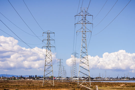 High voltage electricity towers and power lines on the shores of San Francisco Bay, Palo Alto, California