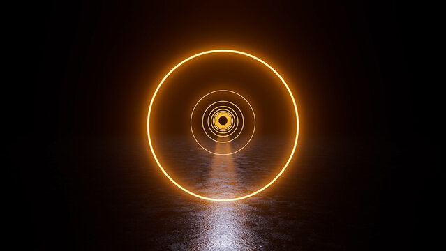 Glowing orange neon circles are creating a futuristic tunnel on a dark background with reflections, ideal for backgrounds and designs related to technology, future, and innovation