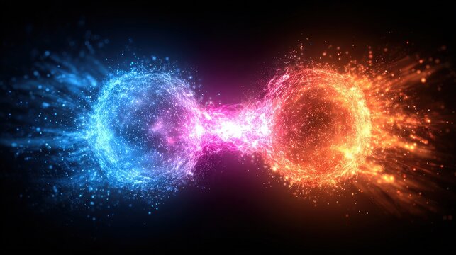 A dynamic display of blue and orange spheres colliding, creating a burst of light and energy in a cosmic environment.